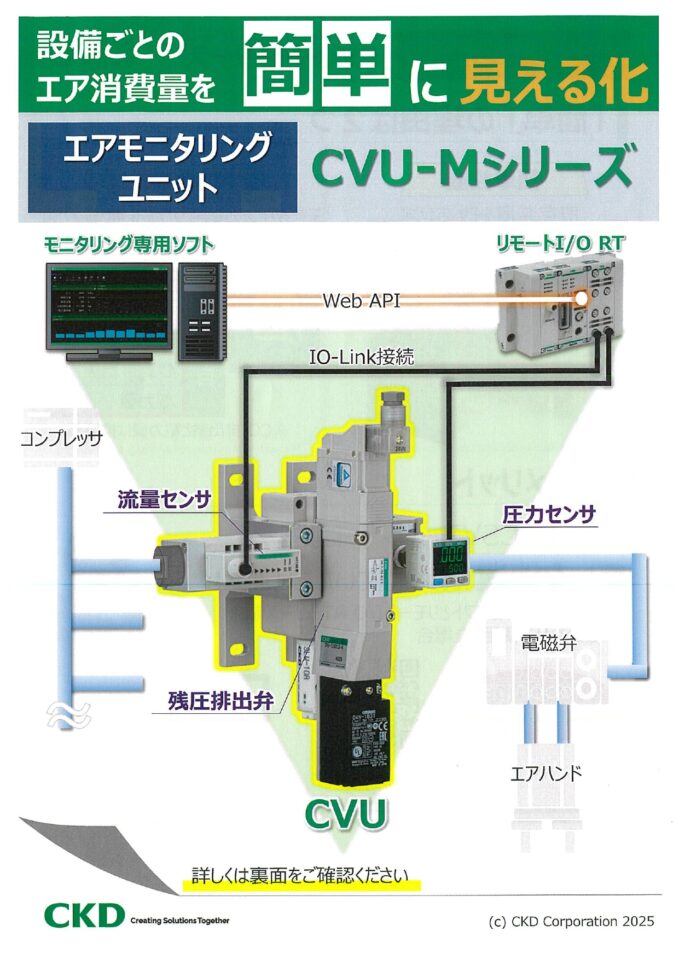 CVU-Mシリーズは、流量・圧力センサと連携し、設備ごとのエア消費量をリアルタイムでモニタリング。専用ソフトやWeb API、IO-Link接続にも対応し、既存のシステムにスムーズに組み込めます。